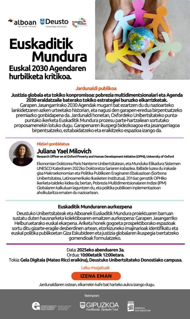 Datorren abenduaren 3an, Deustuko Unibertsitatearen Donostiako campusean “Justizia globala eta tokiko konpromisoa: pobrezia multidimentsionalari eta Agenda 2030 eraldatzaile baterako tokiko estrategiei buruzko elkarrizketak” jardunaldia izango da. Bertan, Euskadik Garapen Jasangarrirako Helburuei egin dien ekarpenaren inguruko hausnarketa kolektiboko prozesuaren emaitzak aurkeztuko dira, Deustuko Unibertsitateak eta Alboanek bideratutako Euskaditik Mundura proiektuaren barruan. Jardunaldian Juliana Yael Milovichen hitzaldi bat ere izango da. Juliana Oxfordeko Unibertsitateko ikertzailea da, eta Ekonomian doktorea Paris Nanterre Unibertsitatean. Munduko Elikadura Sistemen UNESCO Katedraren Doktorego Saria jaso zuen 2022an. 2016az geroztik, OPHIko ikerketa taldeko kide da, eta Pobrezia Multidimentsionalaren Indize Globalaren kalkuluan laguntzen du. Gainera, nazioartean politika publikoak ezartzeko aholkularia ere bada.